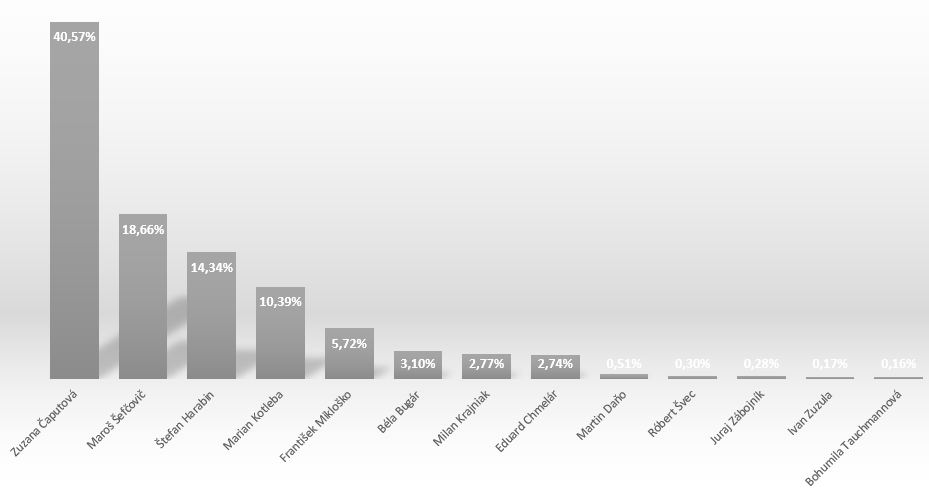 Po sčítaní 50% hlasov ukázalo, že prieskumy boli celkom presné. O 12. hodine nasledujúceho dńa ŠÚ SR zverejnilo oficiálne výsledky volieb, v prvom kole uspeli Zuzana Čaputová a Maroš Šefčovič a pokračujú do druhého kola, ktoré bude v sobotu 30. marca.